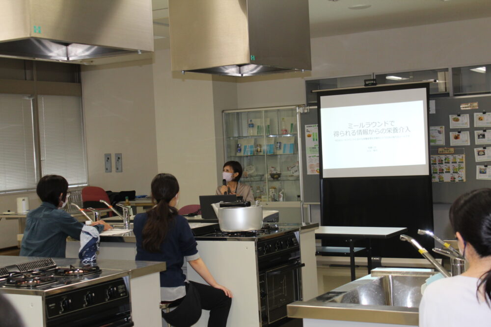 (午前の部)宇部フロンティア大学短期大学部 准教授 田辺のぶか先生をお招きし、①摂食嚥下の講義、②調理実習、③ミールラウンドの観察ポイントについての研修会を開催しました。田辺先生の講義は、専門的な内容でありながらも非常に分かりやすく、参加者一人ひとりが嚥下の仕組みや支援の重要性を深く理解することができました。
