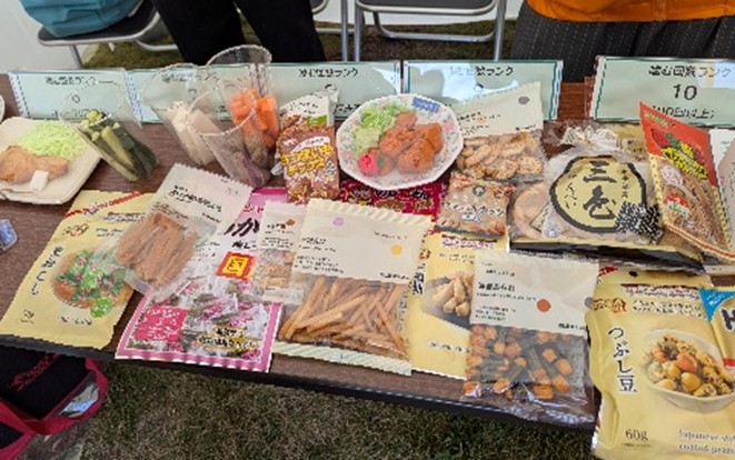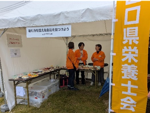 やまぐち健口フェスタにて栄養士会ブースを訪れてくれた家族へ実際に咀嚼回数ランク別(1~10)の食品展示を見学していただき、噛む力と普段の食事での食品選択の関連性を説明しました。さらに噛む力を鍛える食品やレシピについて山口県栄養士会で作成したレシピを配布して解説しました。
