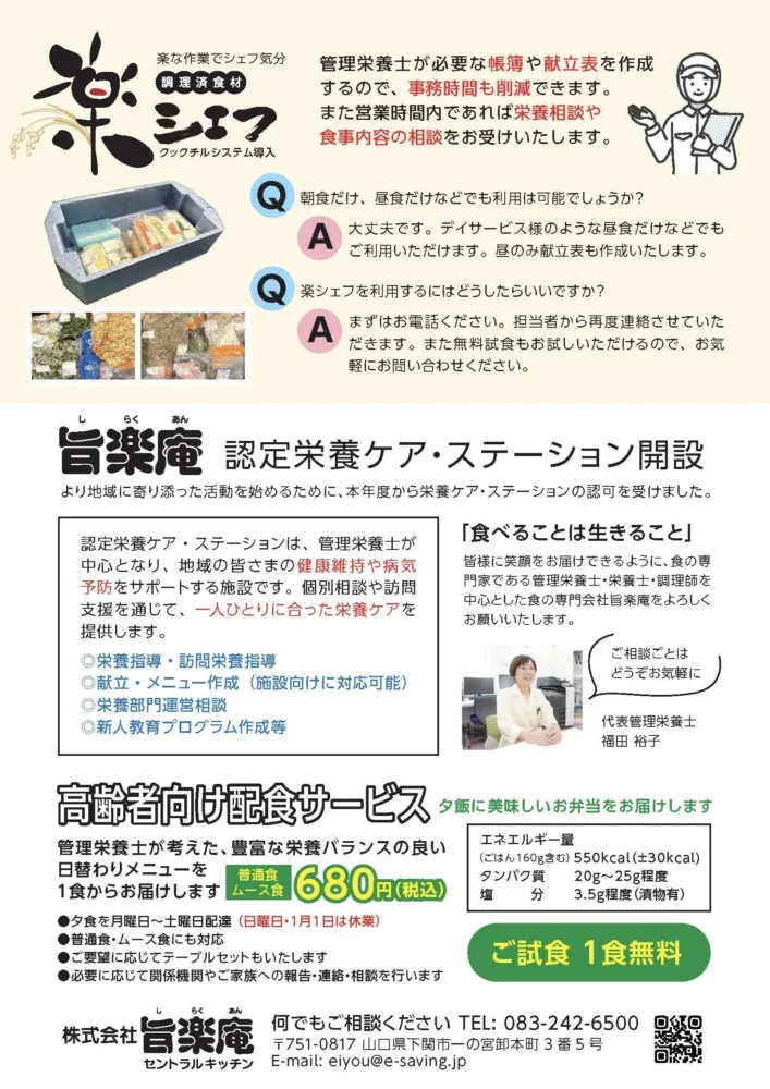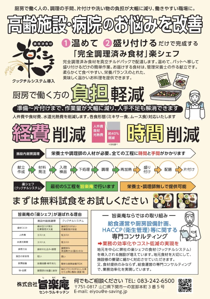 旨楽庵は、地元食材を活かしたクックチルシステム「楽シェフ」を用いた完全調理済み食材の提供や、給食運営・厨房設備計画・HACCP(衛生管理)に関する専門コンサルティングを行っています。