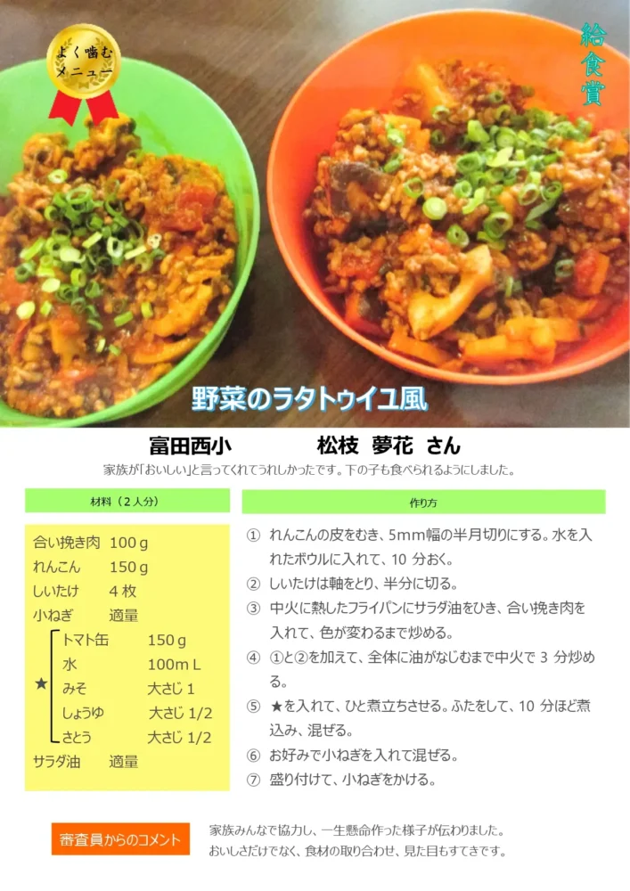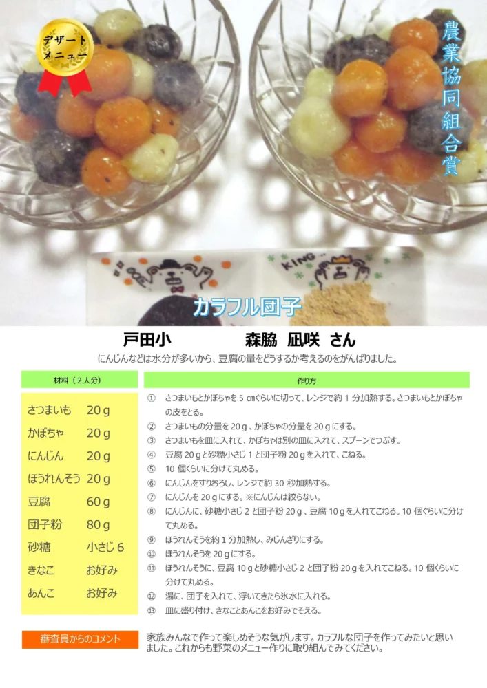 子どもたちが考案した野菜を使った多彩なレシピが紹介されており、各作品の写真・材料・作り方・審査員コメントがまとめられています。