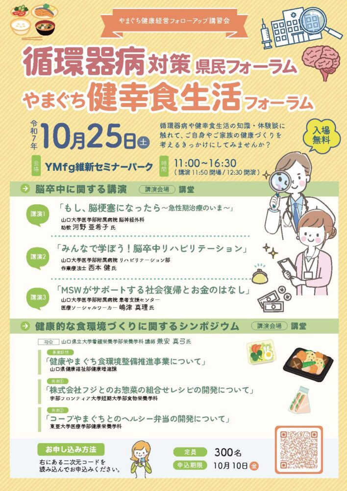 循環器病の予防や健康的な食生活について学び、実践するきっかけとすることを目的に、「循環器病対策県民フォーラム・やまぐち健幸食生活フォーラム」が開催されます。