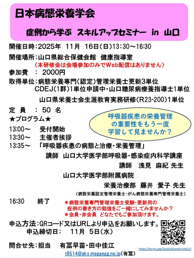 日本病態栄養学会主催による「症例から学ぶ スキルアップセミナー in 山口」が開催されます。